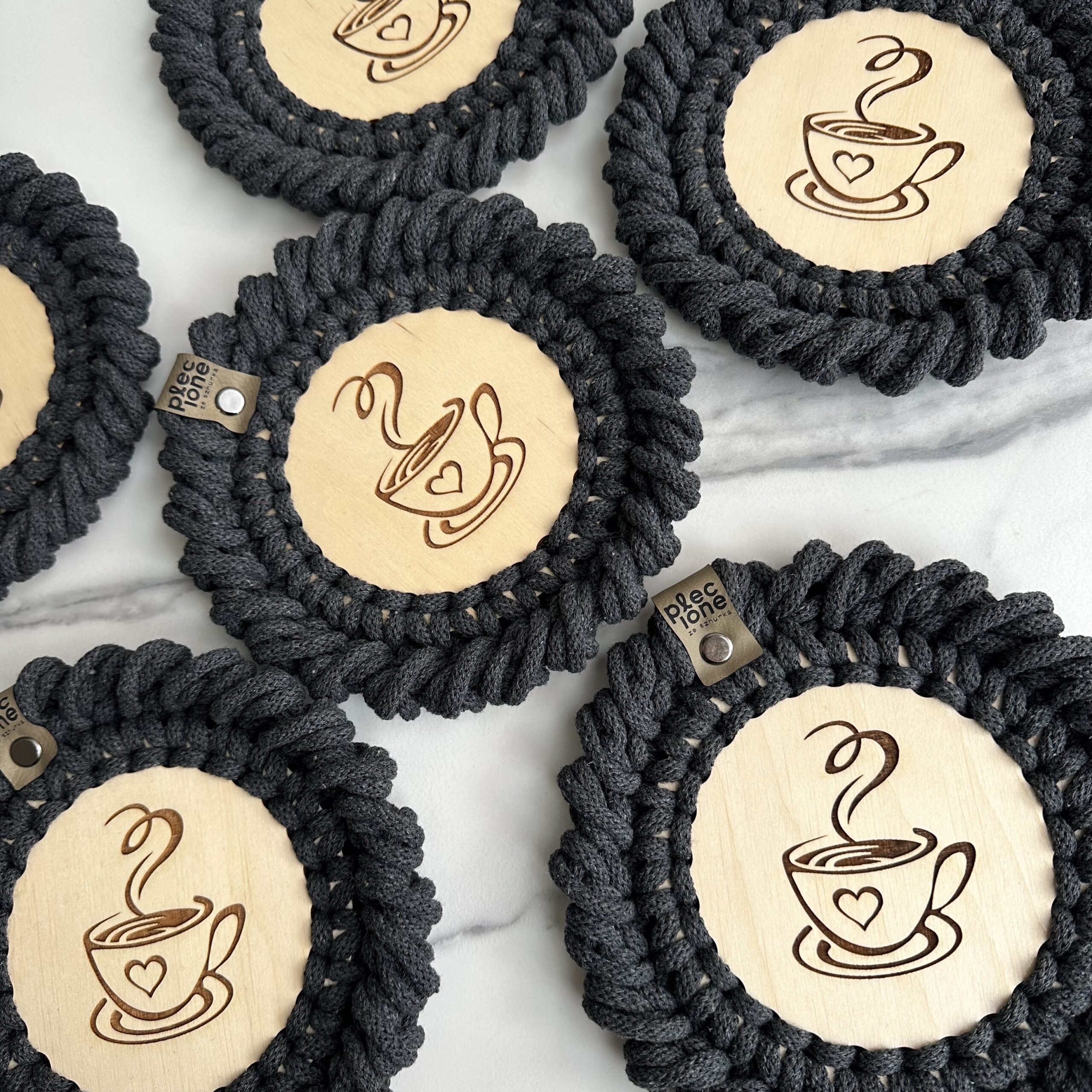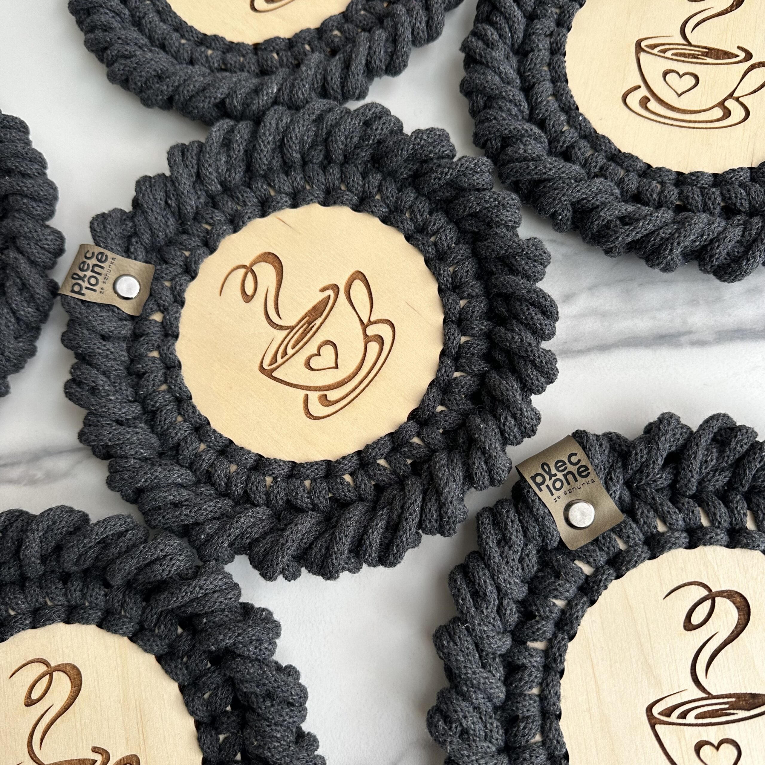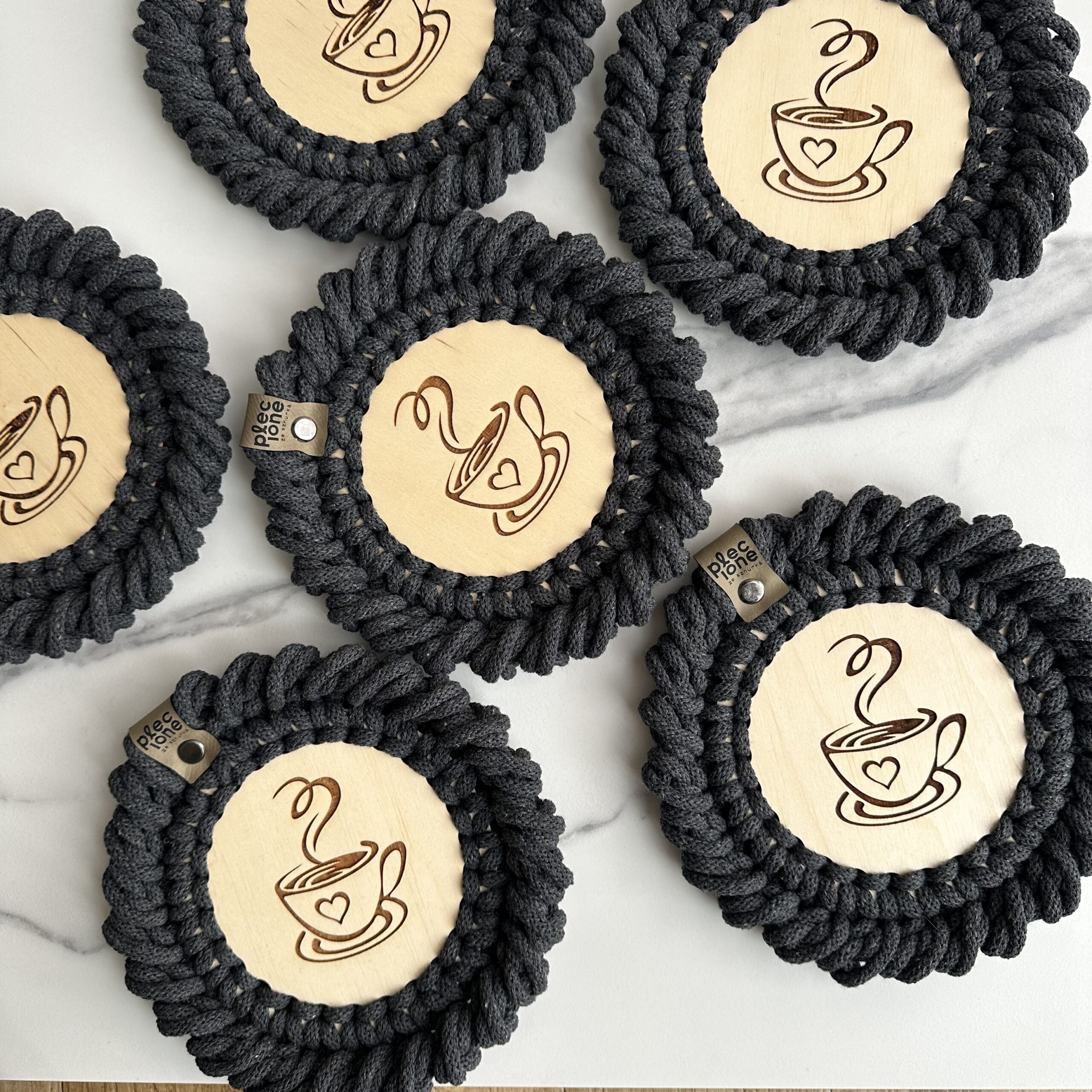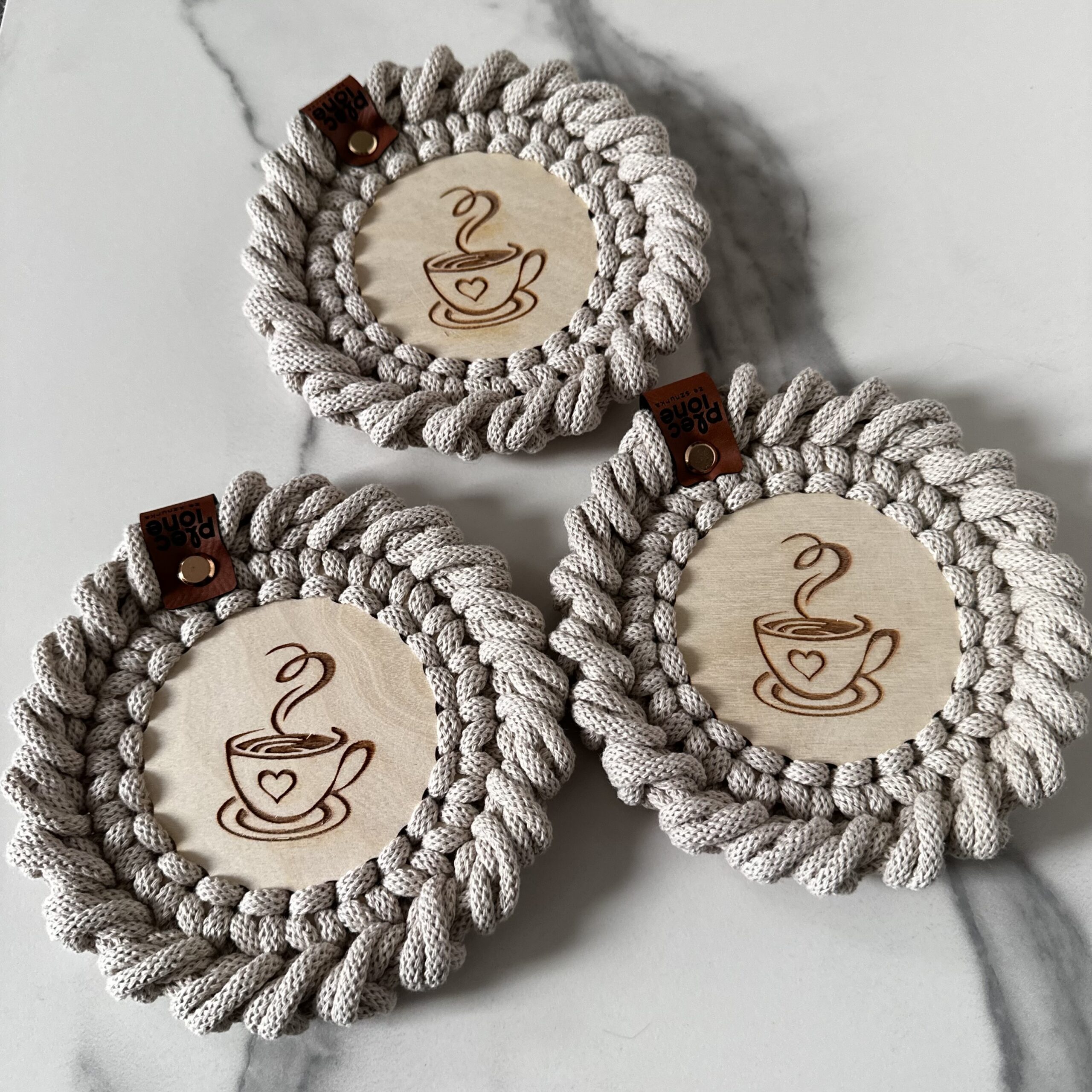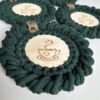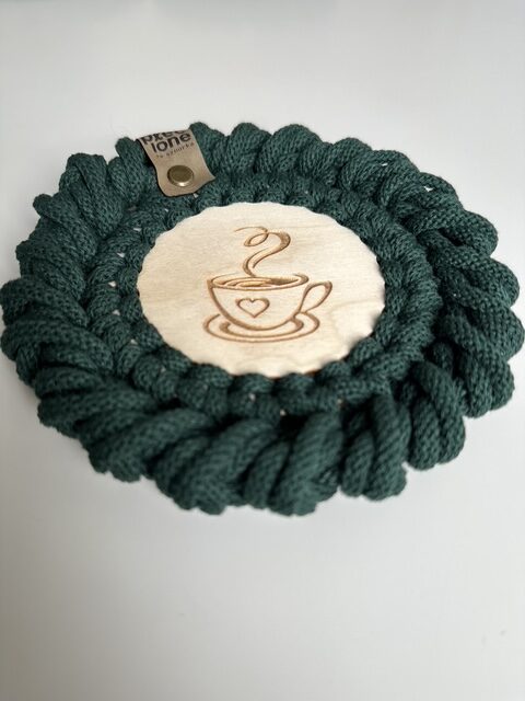Podkładki pod kubki plecione ze sznurka bawełnianego z rdzeniem poliestrowym o średnicy 5 mm. Jest to najwyższej jakości sznurek polskiego producenta.