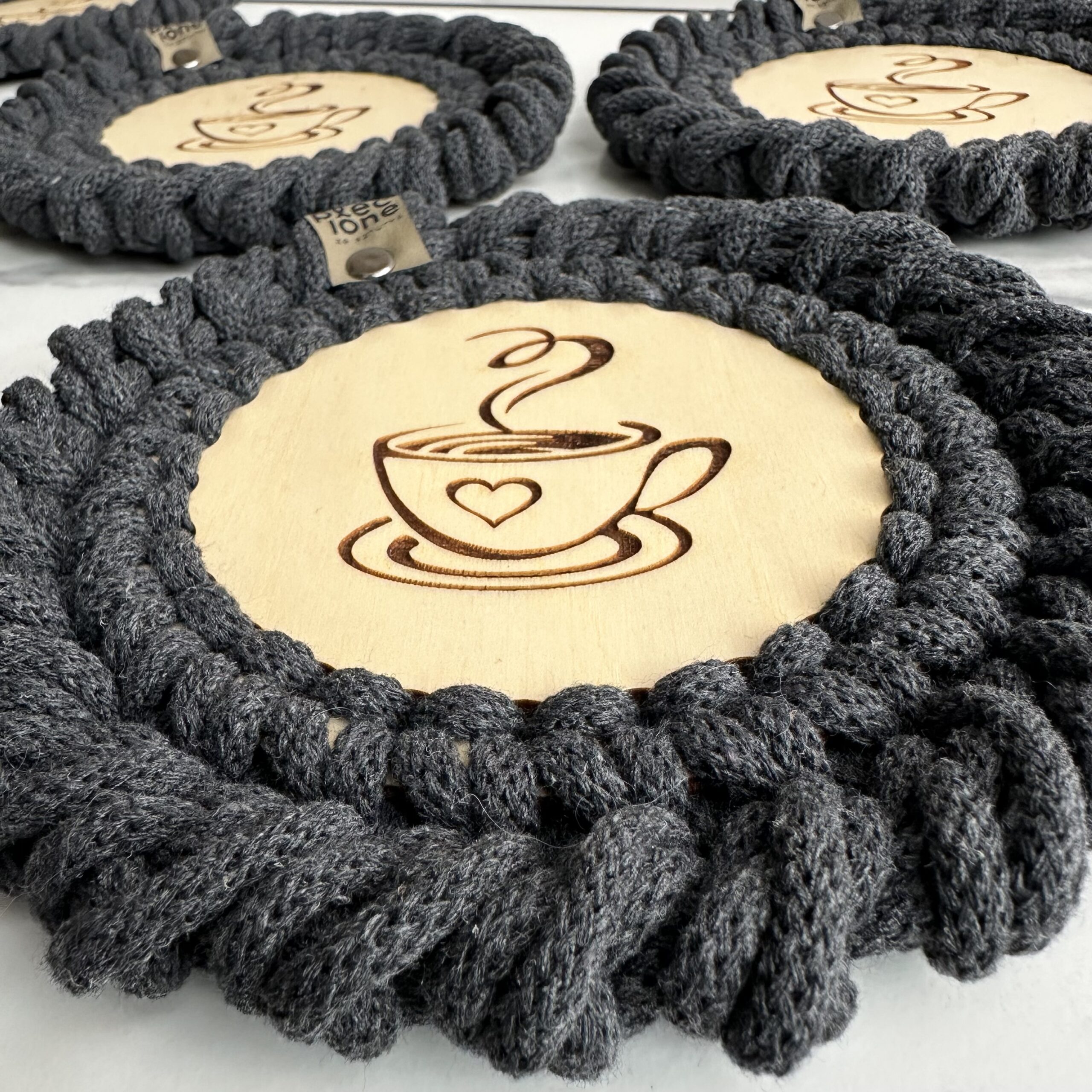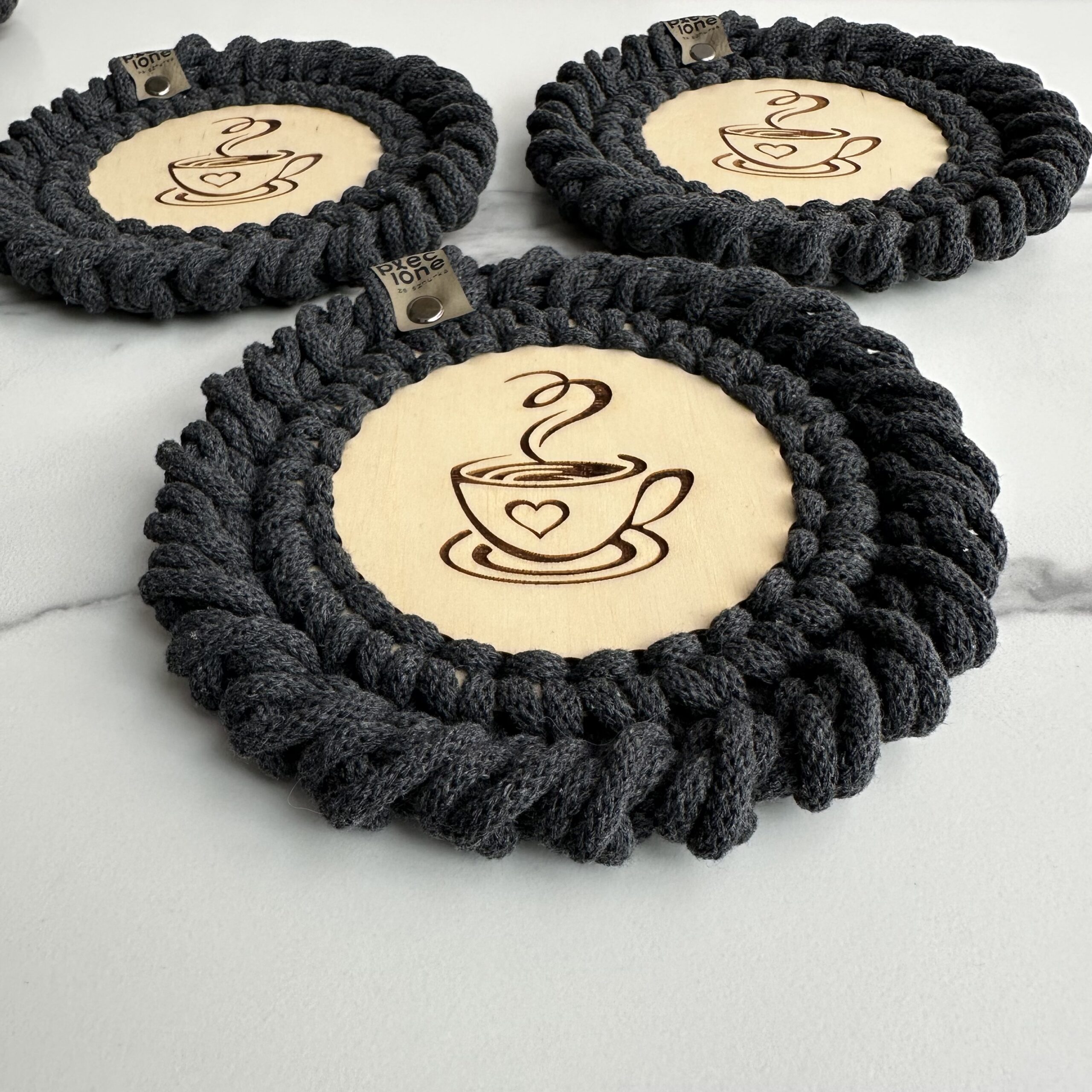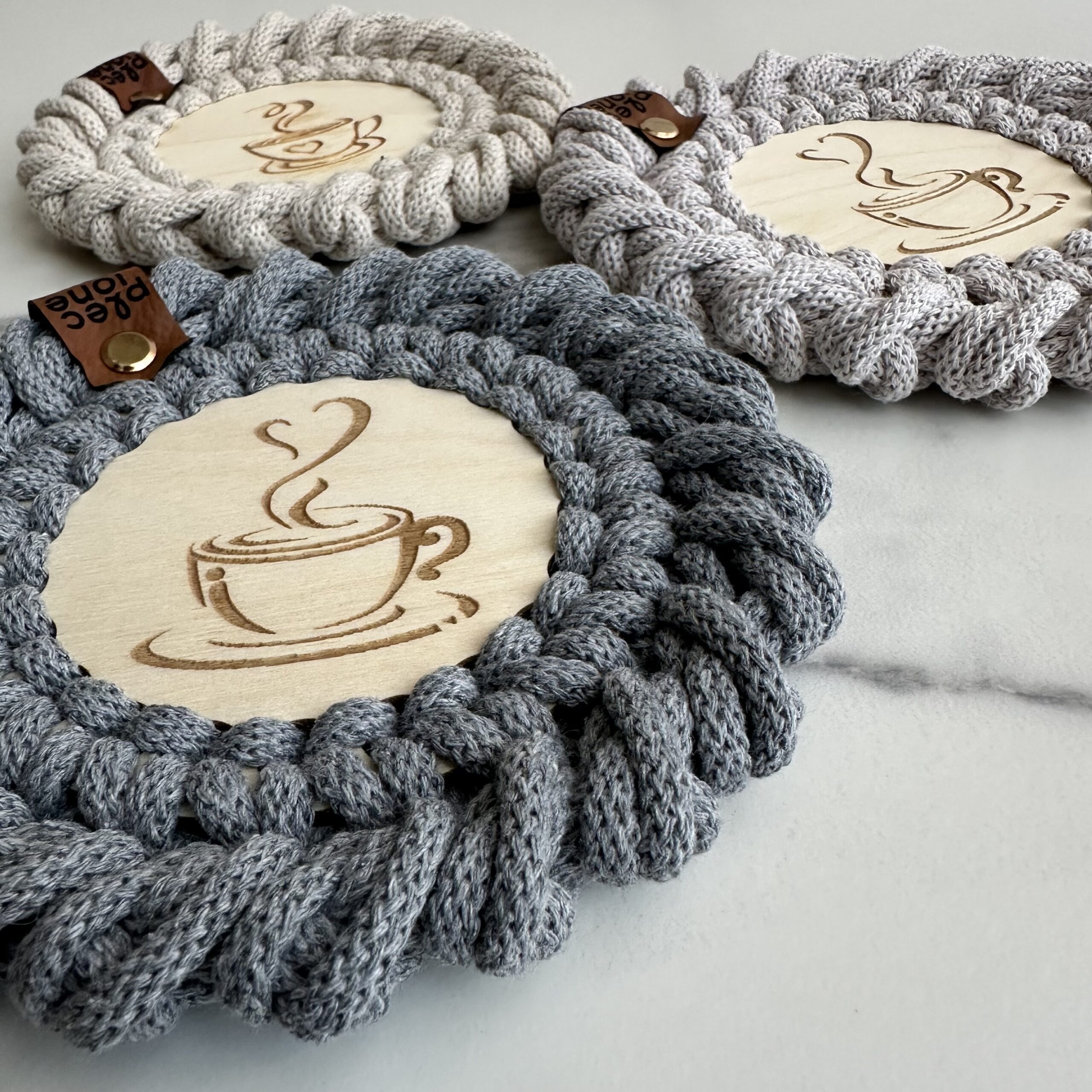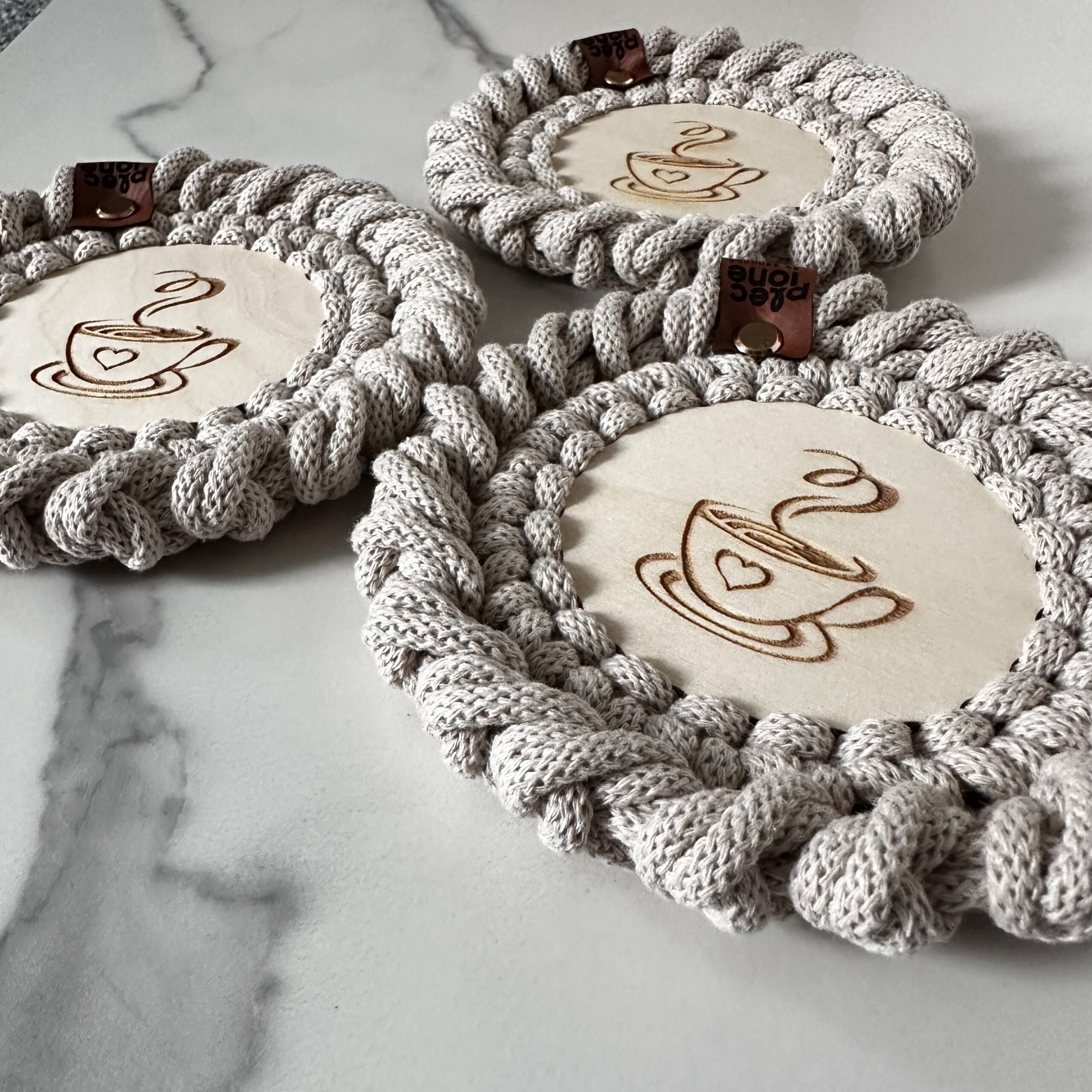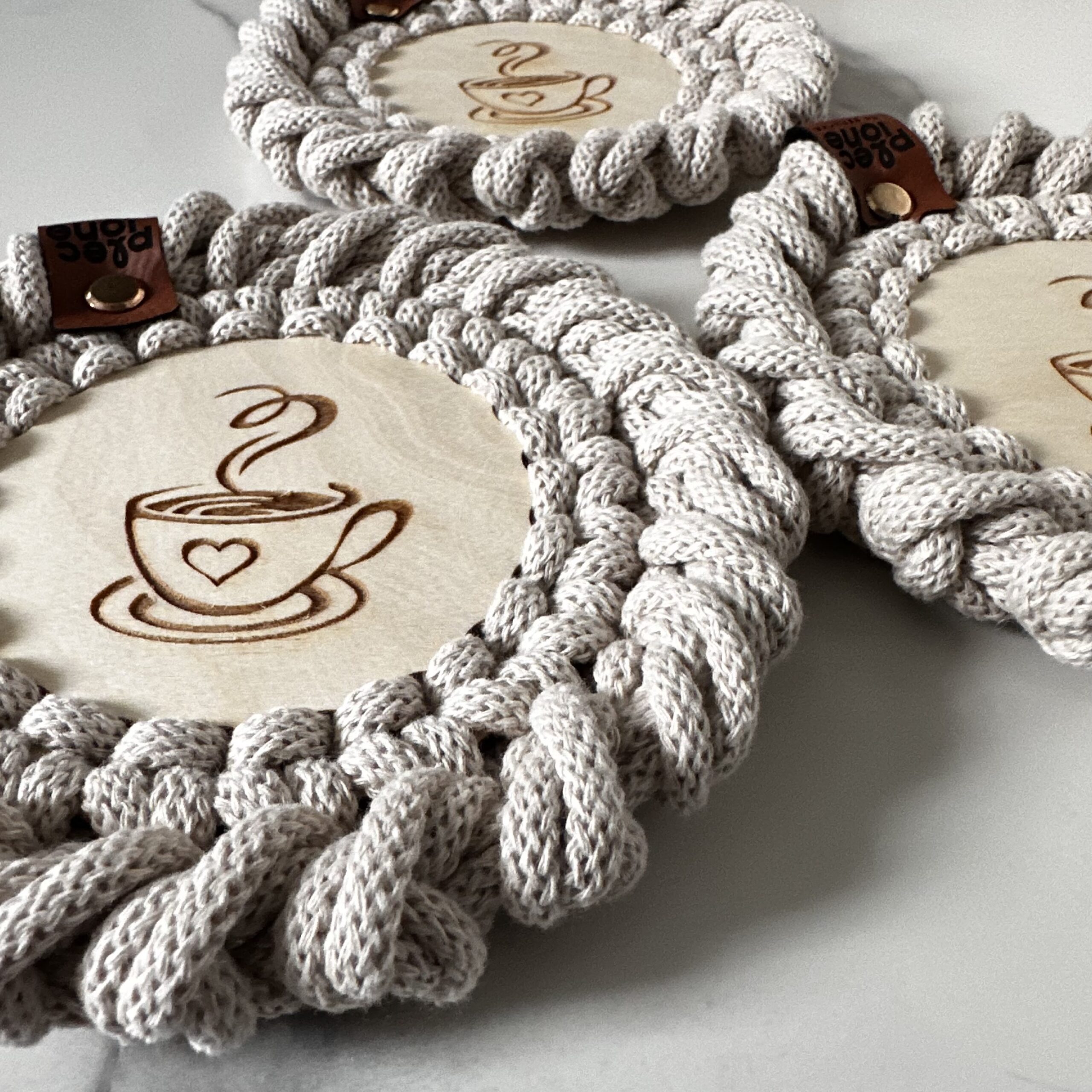 Podkładki pod kubki plecione ze sznurka bawełnianego z rdzeniem poliestrowym o średnicy 5 mm. Jest to najwyższej jakości sznurek polskiego producenta.