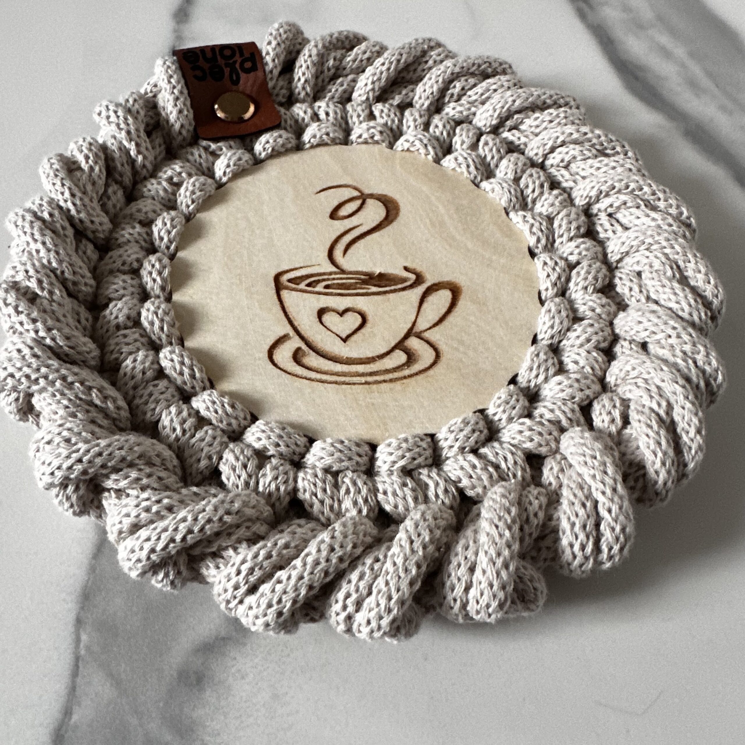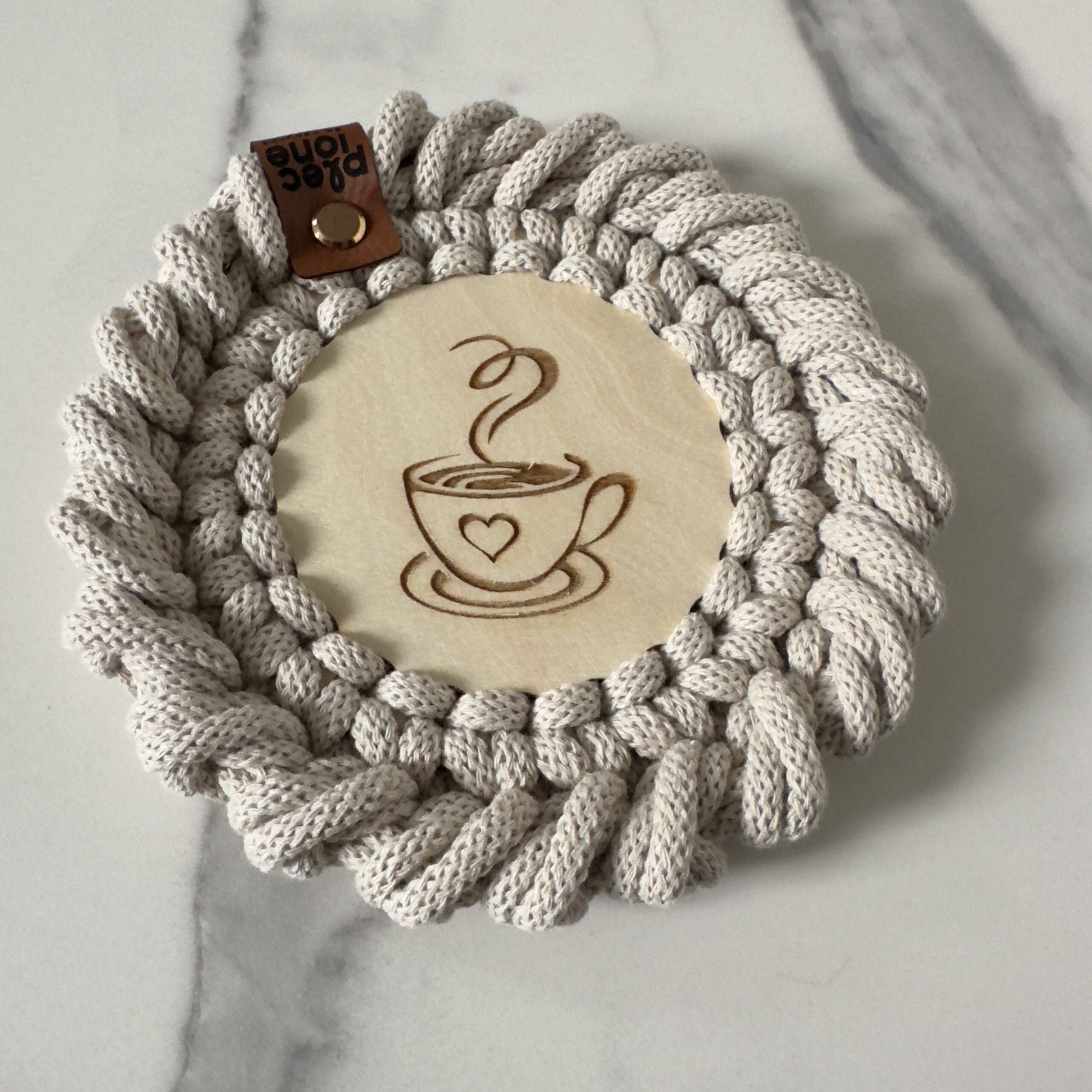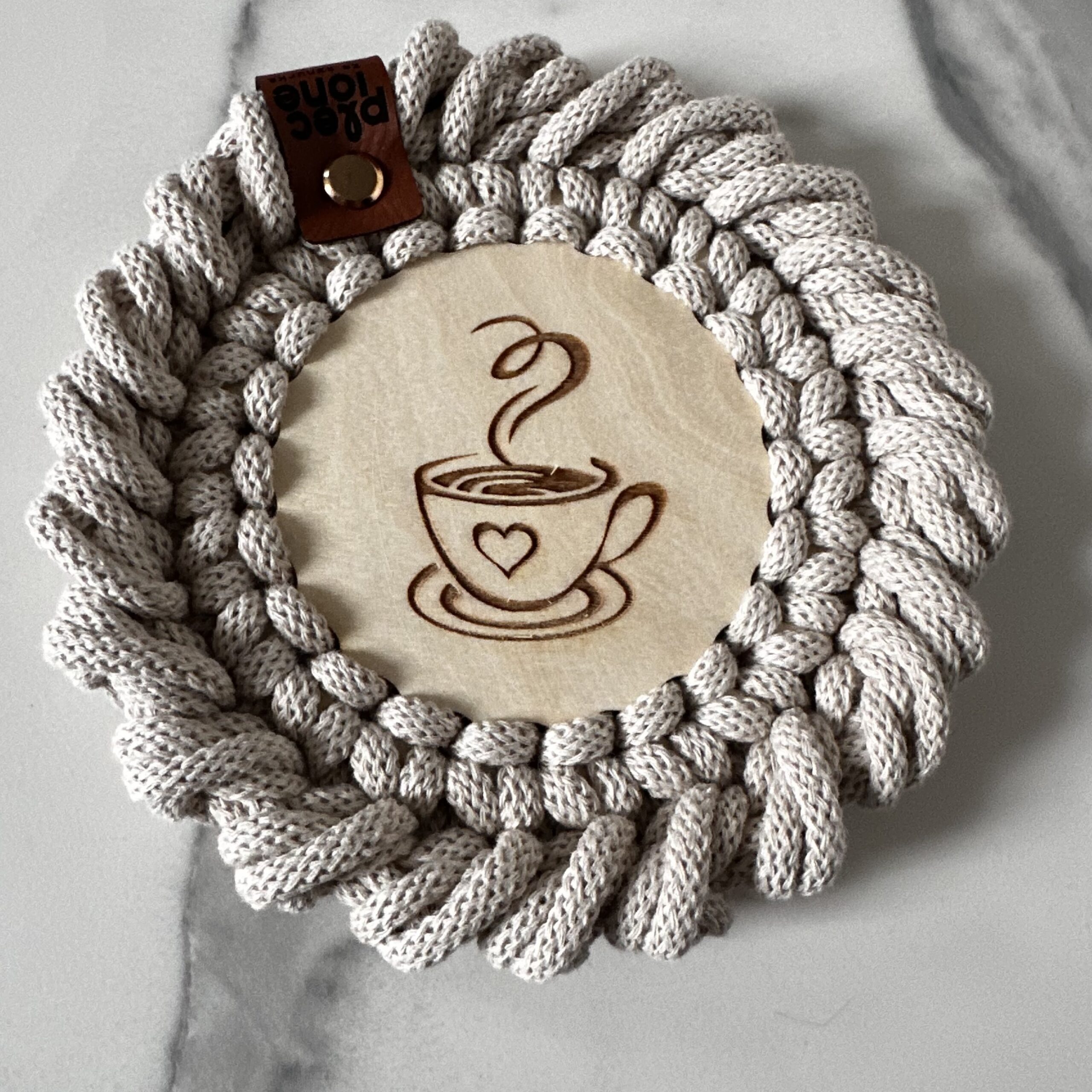Pleciona ze sznurka bawełnianego 5 mm piękna PODKŁADKA POD KUBEK o średnicy około 14 cm na bazie ze sklejki z wzorem KAWY. Wybierz tyle podkładek ile potrzebujesz. Wyjątkowa i niepowtarzalna. Wykonana ręcznie, na szydełku z dbałością o każdy szczegół. Wykończona ozdobnym oczkiem rakowym. Idealny dodatek do wnętrz w stylu Boho, Loft czy Scandinavian.