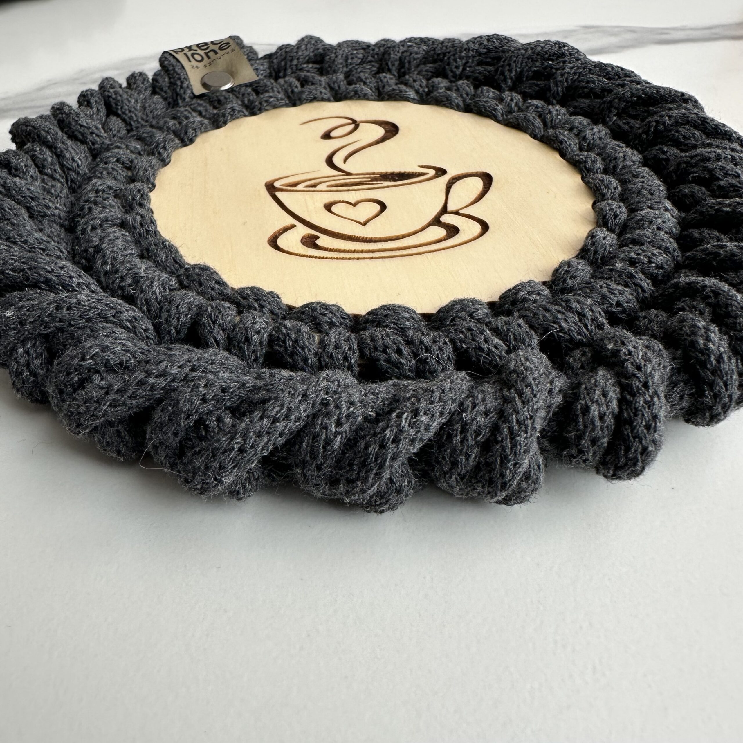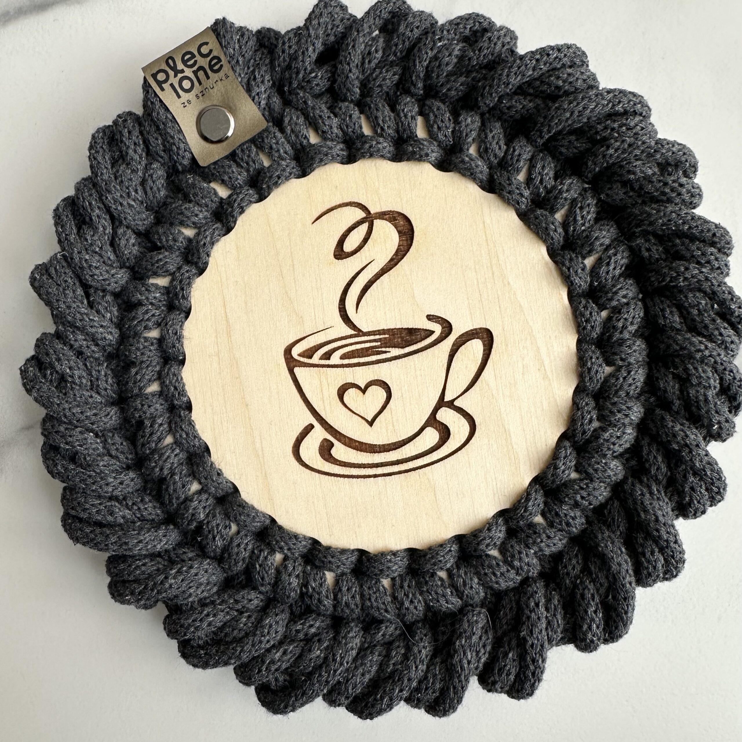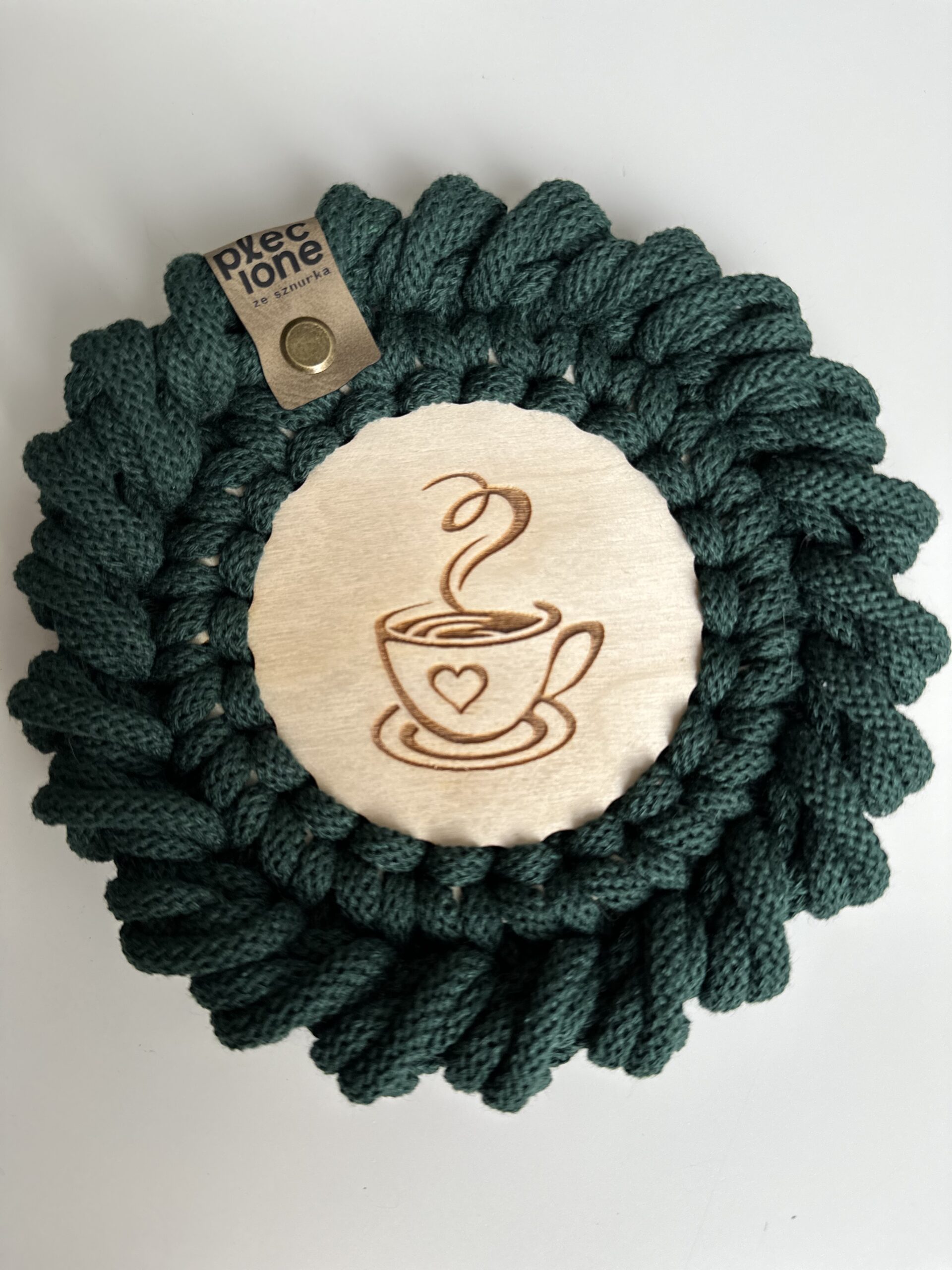 Pleciona ze sznurka bawełnianego 5 mm piękna PODKŁADKA POD KUBEK o średnicy około 14 cm na bazie ze sklejki z wzorem KAWY. Wybierz tyle podkładek ile potrzebujesz. Wyjątkowa i niepowtarzalna. Wykonana ręcznie, na szydełku z dbałością o każdy szczegół. Wykończona ozdobnym oczkiem rakowym. Idealny dodatek do wnętrz w stylu Boho, Loft czy Scandinavian.